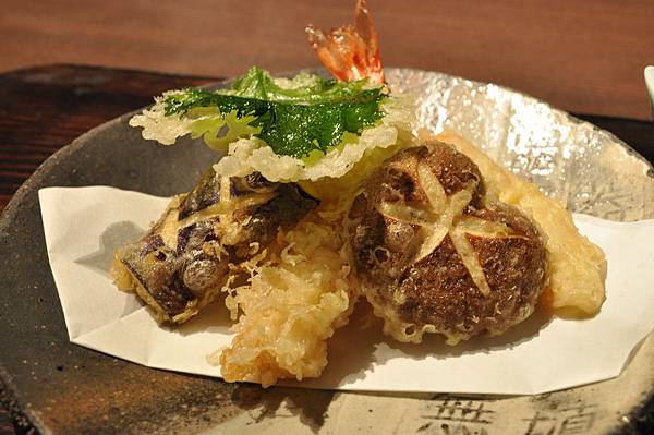 天婦羅有一隻蝦、魚片、茄子、香菇、芋頭、地瓜,薄薄麵皮把食材的原汁都鎖在裡面,